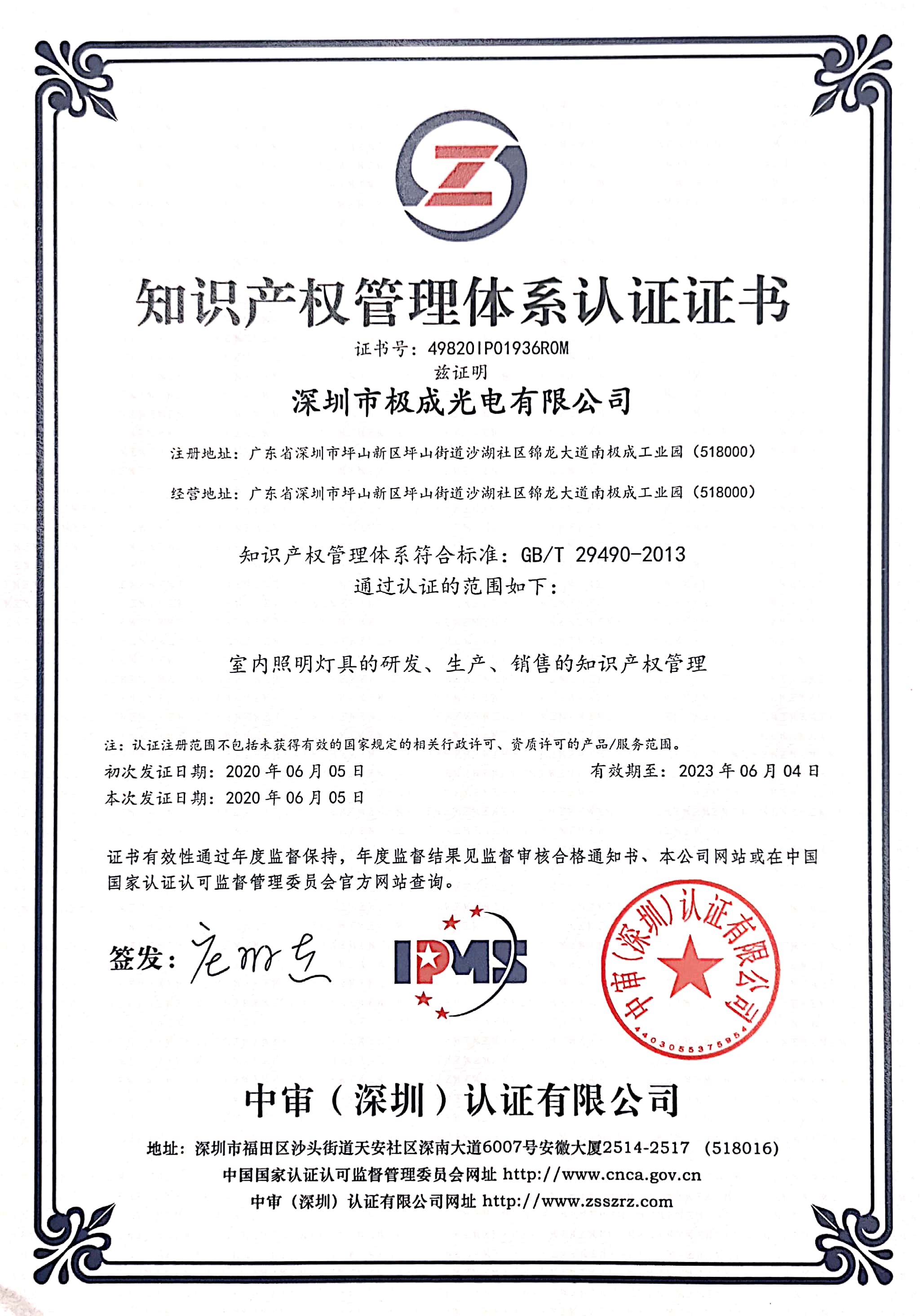 深圳市极成光电有限公司于2020年6月5日起,正式成为国家知识产权贯标企业并获得知识产权管理体系认证证书。这标志着公司知识产权管理规范的标准贯穿公司生产、采购、研发、销售、管理等各个环节,在知识产权创造、运用、管理和保护方面全面进入常态化。