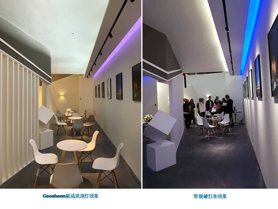 会客体验区,展示了洗顶灯,整个天花明亮通透。同常规的硬灯条洗顶效果做了一个对比,让来体验的观众印象深刻。