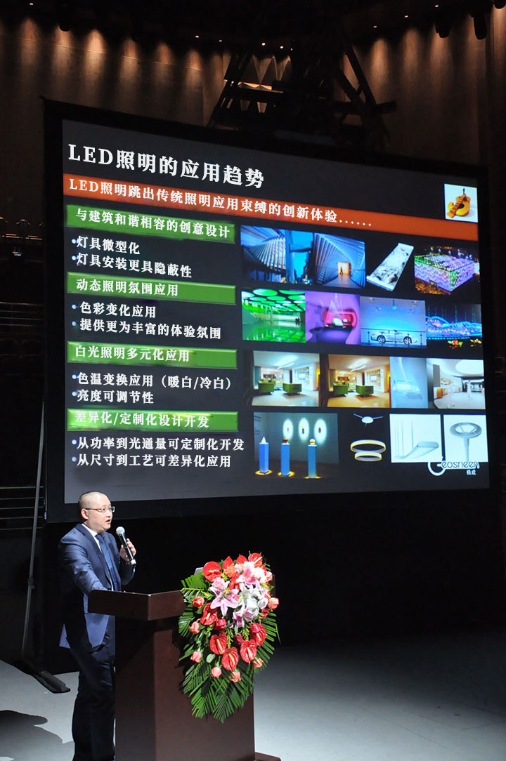 首先,深圳市极成光电有限公司国内营销事业部总经理朱明先生围绕《近距离走进LED》进行主题演讲。他讲述如何选择专业的LED产品,专业的LED品牌不仅仅提供产品,所提供的是整体照明解决方案,营造满足不同功能空间的光环境。极成LED作为米兰世博会中国馆室内照明唯一指定供应商,成功地运用专业之光点亮了中国文化。