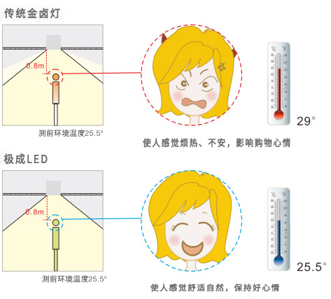 通过上图可以看出,环境温度25°时,一盏极成LED照明在照明半小时后的环境温度在25.5°。给人的感觉舒适自然,保持好心情。传统金卤灯在同样的25°环境温度下,照明半小时后的环境温度上升到29°,给人的感觉烦躁、不安、影响购物心情。在这样的环境里面客户是没办法长时间逗留的。
