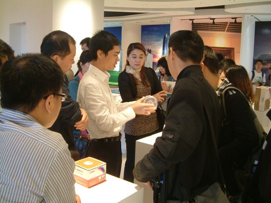 极成光电董事长林陈锋向来访媒体人员介绍极成Geosheen LED照明产品