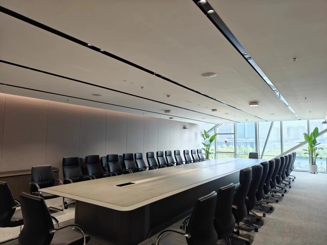 会议室专为集思广益、共商大计而设的空间,以其简洁明亮之姿,诠释着高效与现代的融合。天花顶黑色的凹槽设计如星河般引导着视觉的延伸,似乎要将人们的思绪引向那深邃无垠的宇宙。而平顶天花上,Geosheen极成防眩天花灯巧妙地隐匿其中,既满足了会议的照明需求,又巧妙地避免了眩光的干扰。暗藏的软灯带,则如同细水长流,发出柔和而温暖的光芒,为整个空间增添了几分宁静与雅致。在这样的环境下,每一个角落都弥漫着和谐与舒适的气息,仿佛时间在这一刻凝固,只为让人们更好地沉浸在思维的海洋中,激荡出智慧的火花。