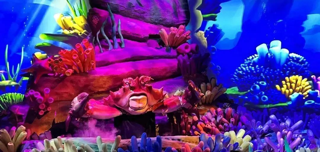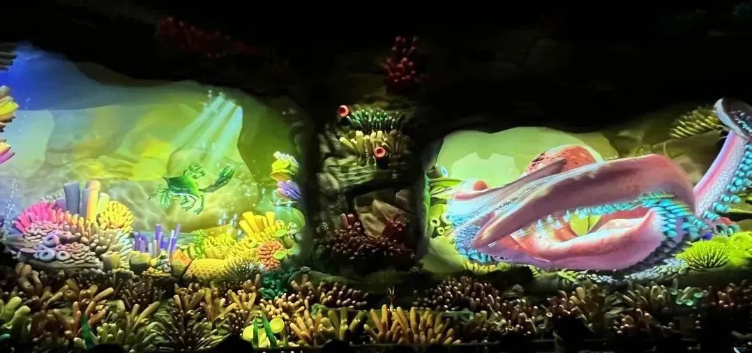 海螺湾的入口处有个巨大的墨鱼,周围会喷射水雾,氛围感做的很到位。剧场的表演主打4D技术×立体巨屏通过逼真的视觉效果,结合活动机模,烟雾,光电等特技,还原了一个色彩斑斓的海洋世界。