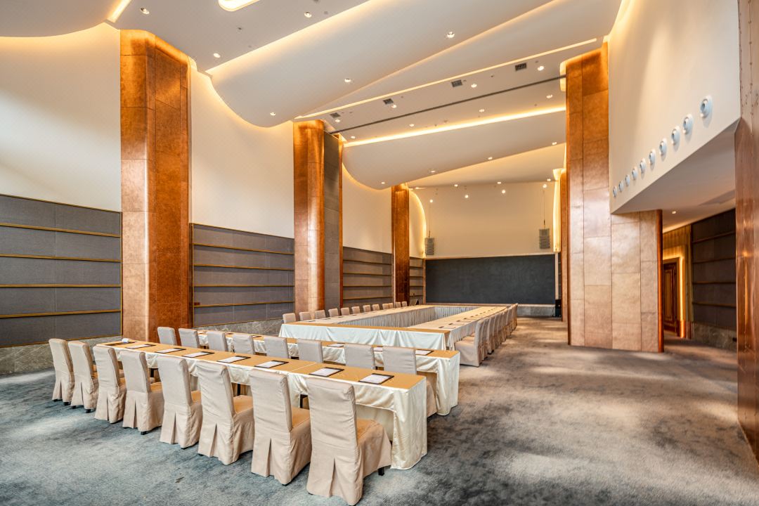 会议室兼具典雅与时尚,给人浪漫细腻的氛围。天花处的深藏防眩天花灯为会议室提供基础及重点照明,加上暗藏在凹凸不平的凹槽处的灯光,光影相错,天花似涛声暗涌,使空间变得灵动。