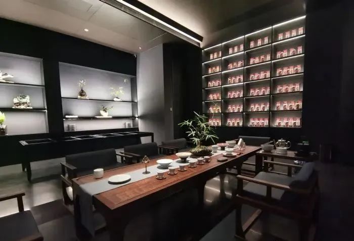 饮茶区在用灯上致力于简约的风格,射灯为茶台、装饰品提供重点照明,暗藏的灯光从里透出,提升空间的层次感和氛围感,明暗之间,让宾客在这里品茶会友,悠然自得。