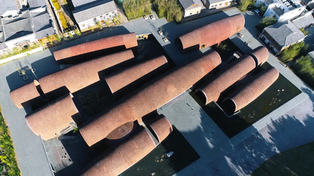 博物馆建筑以模仿老砖窑的拱顶为建筑语言,由八个长度不一、大小各异的多曲面钢筋混凝土拱体结构构成,拱顶借鉴传统窑炉的砌筑工艺,通过内外两侧两层砖之间浇筑混凝土手工建造。