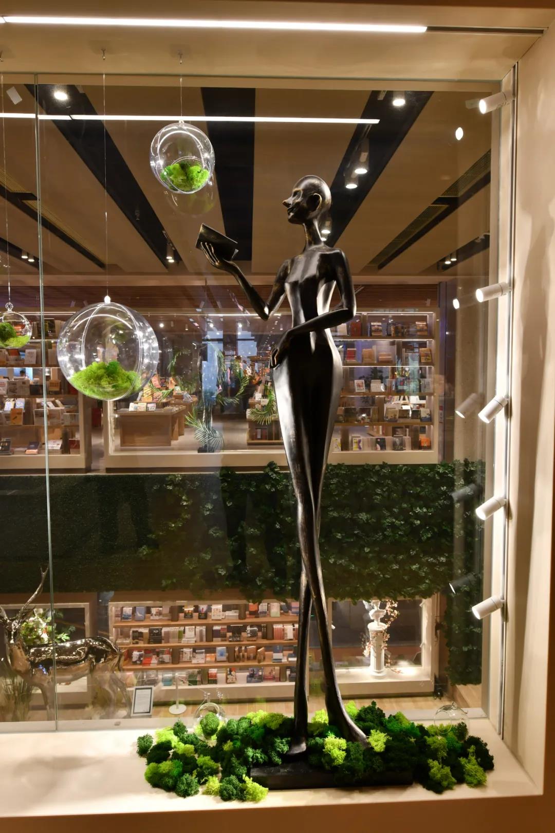 橱窗里的艺术装置是毕业于英国DMU大学建筑设计学院的张宇轩设计,名为“共生”,它所表达的中心思想是人与自然和谐共处,贴合读书阁艺术文化、绿色自然的主题。展柜边缘放置的Geosheen极成灯带和轨道灯营造重点且无眩光的照明环境,给人以与众不同的美学体验时,还可在视觉上突出展品。