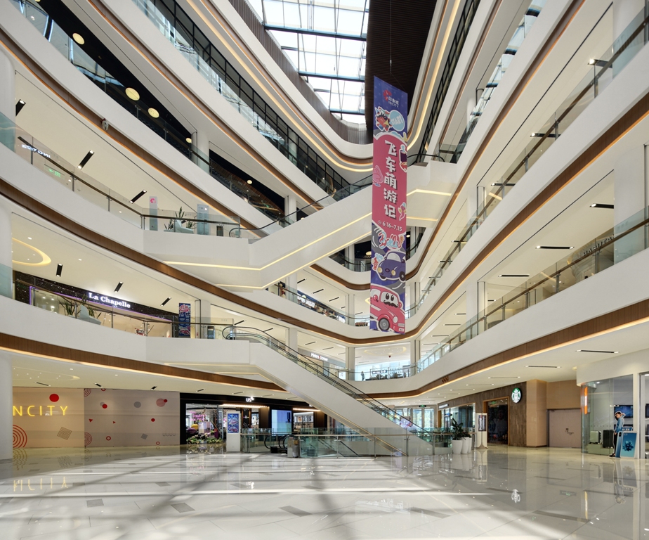 日光透过中庭上空照亮商场内部,