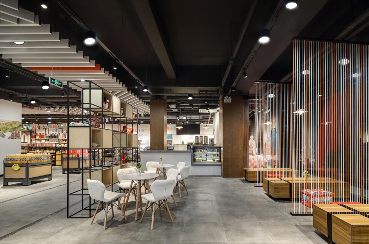 图6灯光聚焦靠墙陈列架、中岛陈列上,走道照明略低,消费者视线自然而然就在陈列的产品上。