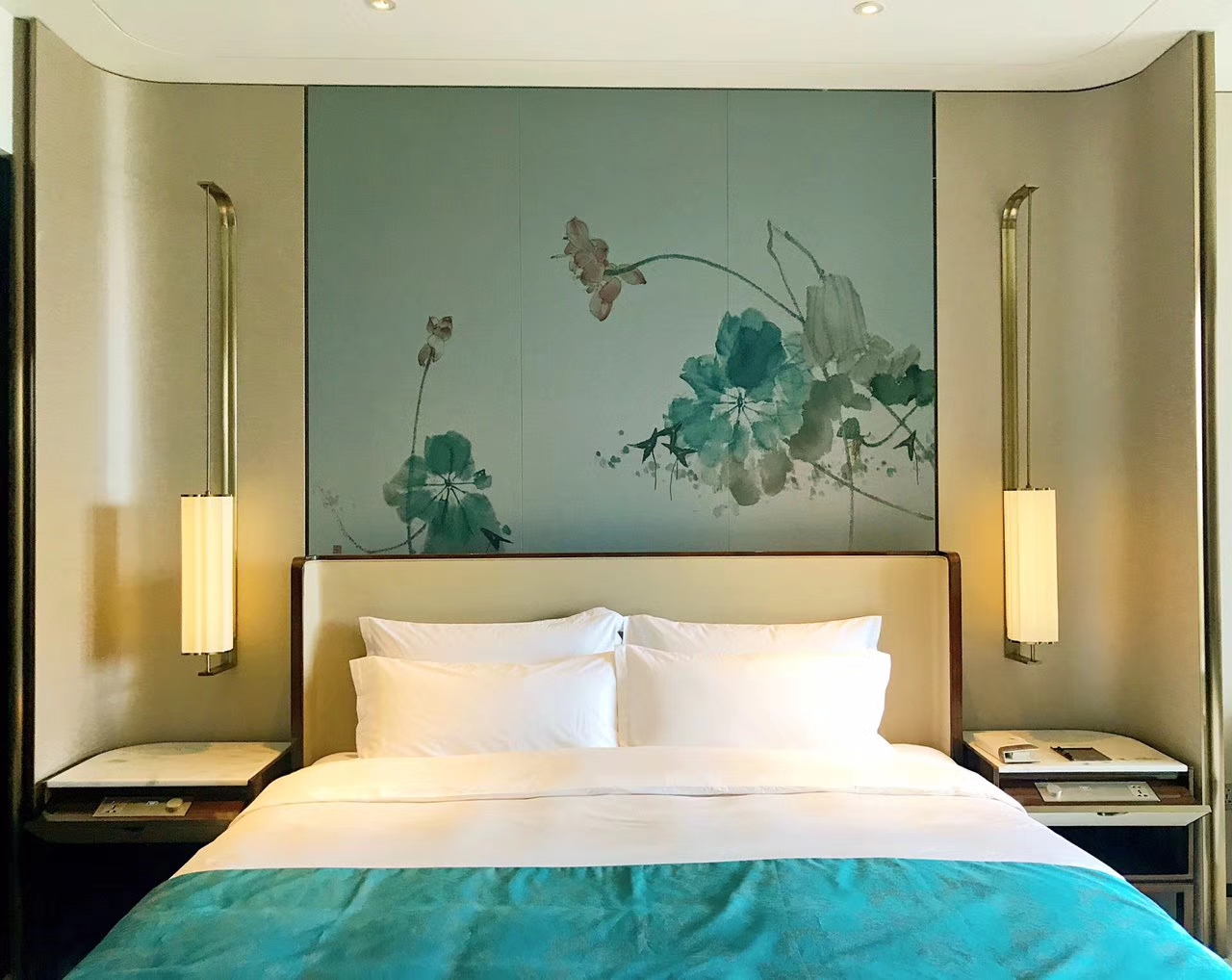 客房基础照明的暖色调配合空间蓝绿、紫红的低饱和度高级色调,配合暖色的少许光斑打亮立面,空间情绪酝酿着温馨和体贴,氛围上先行给入住者周到的舒适体验。而落地灯造型取莲花造型,似是随意安置沙发一角,收拾别致精巧,生出偏安一隅的雅致意趣。入门即给入住者一种,恬淡自然,极有生活品味和追求的高级感。