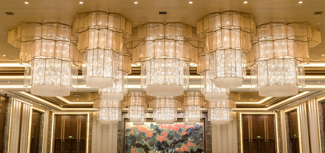 宴会厅主灯能直接决定其空间气质。宴会厅选取的这款莲花花灯,神形兼备奠定宴会厅不俗的格调——莲花花瓣与花梗的线条为形,半透明灯具材质、水晶与点状光源的搭配,“不蔓不枝,中通外直”的君子气度表达得形神具备。