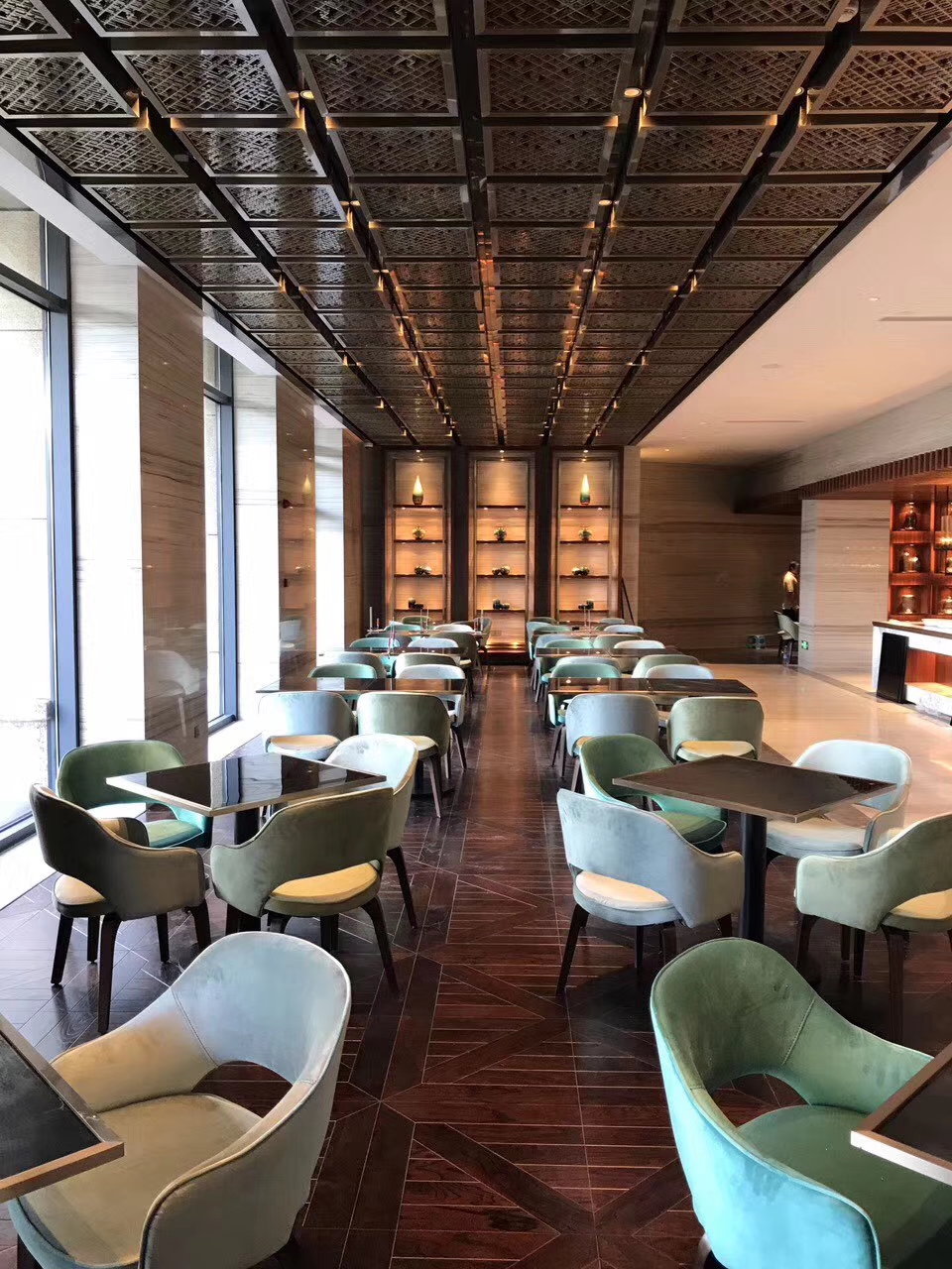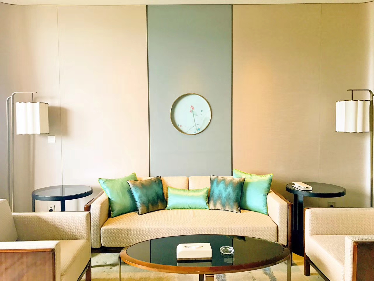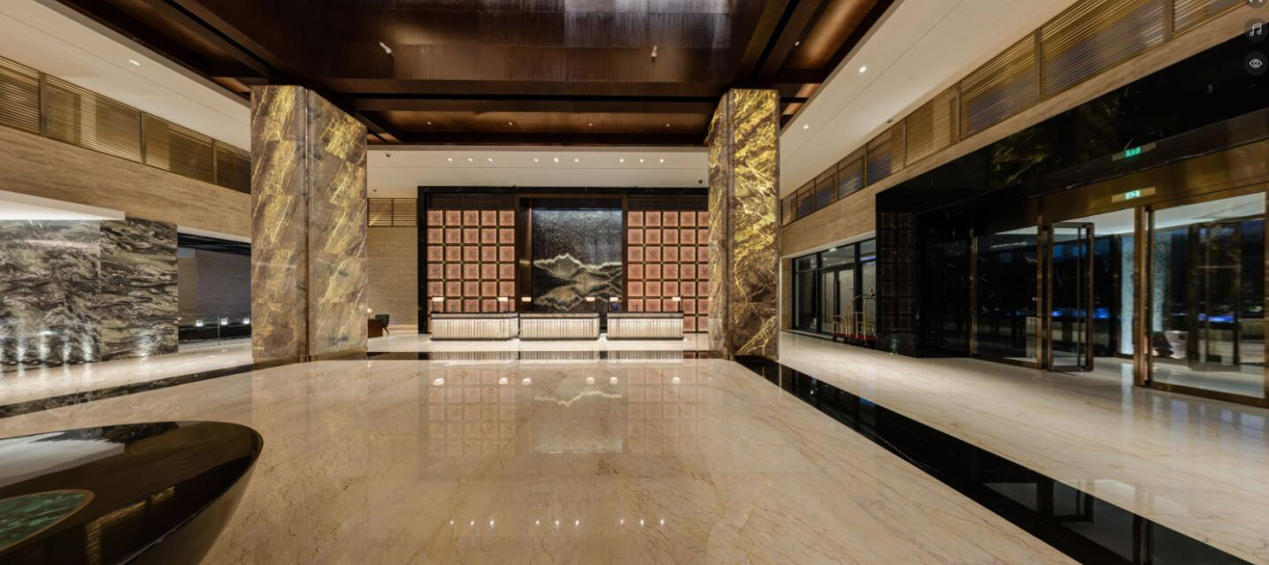 其大堂的硬装与软装杂糅现代美学技艺与中国传统风骨,以江水纹波做基础元素,由此幻化成曲线、莲花、龙腾等意象,大面积应用这些元素以此强调空间调性——落地屏风、柱子饰面、莲花造型吊灯,辅以采用简约的现代线条与技术工艺的家具饰品点缀,且其灯光效果也很恰当地衬托了中国风的设计元素,基础照明控光良好而不滥用灯光,光环境氛围相当友好。这多方的配合,最终让莲花山庄的酒店大堂呈现出现代简约与中式风雅两种美学相融的极致视觉体验。