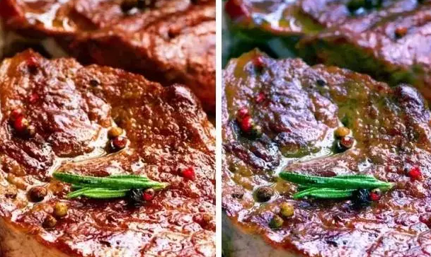 图:你没看错,这确实是同一块牛排被不同灯光照出来的效果,左图让人瞬间食欲暴涨,反观右图,这么“糊蓝的”肉,有点粑粑的感觉...你还有食欲吗?