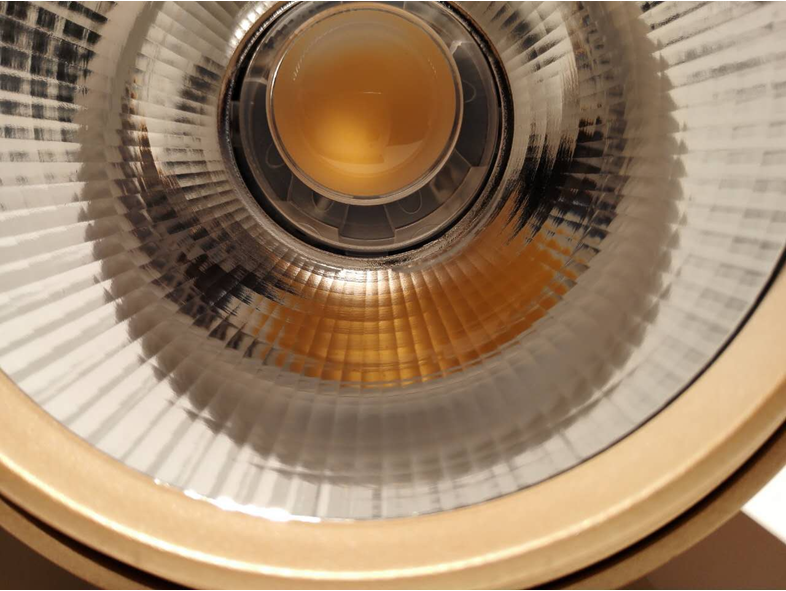 3、使用反射器,对COB LED进行控光。优点:反射器设计技术成熟;缺点:光线利用率低、有副光斑