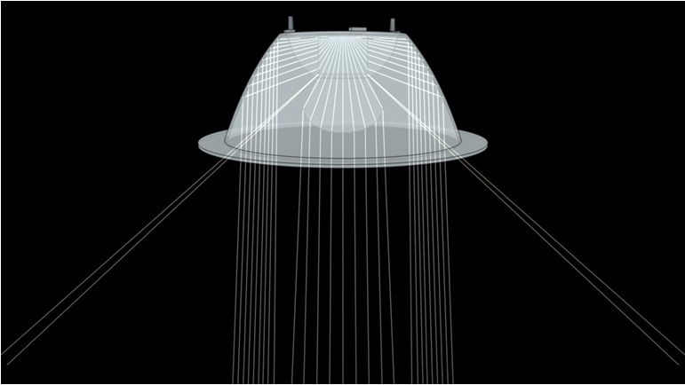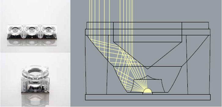2、进阶的控光方法:使用大透镜折射控光。优点:可控光束角及方向;缺点:利用率较低,眩光依旧存在。