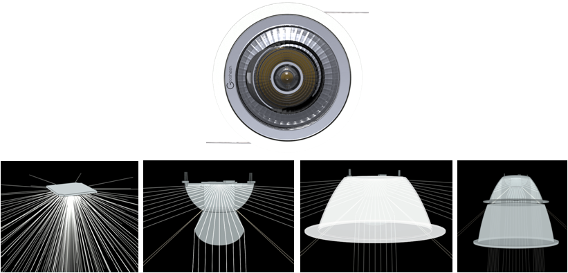 4、目前较为理想的COB LED控光方式:透镜加反射器。既控制了光束方向,又提高了利用率,降低了眩光。