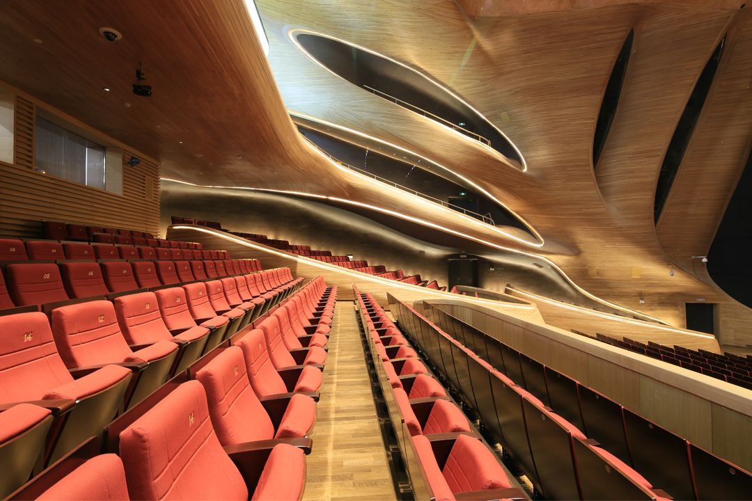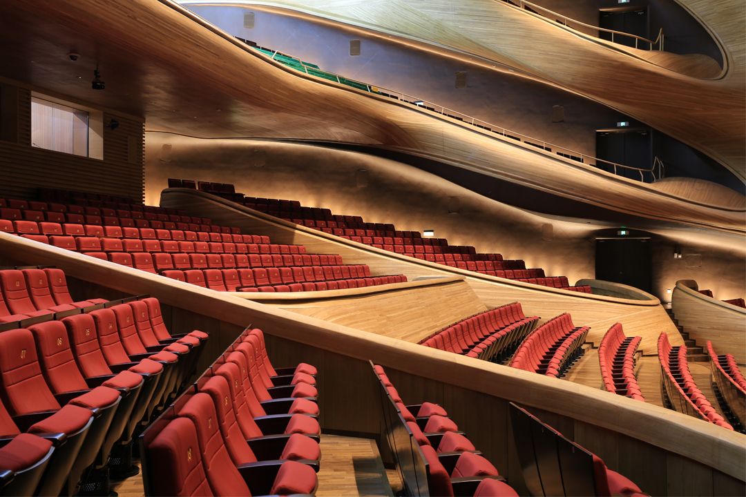 而考虑到材质的灵性与配合剧院本身所需要的声学效果,MAD 团队选择了质感温暖的水曲柳木材,做成环绕大剧场室内外的曲面墙体,兼顾美观性与功能性。